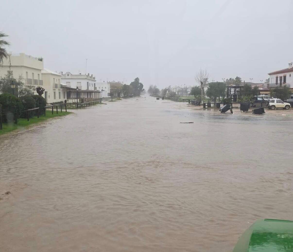 Numerosas calles se encuentran completamente anegadas, lo que supone un riesgo real tanto para vehículos como para peatones. A esta situación se suma que la marisma está completamente llena, impidiendo un desagüe normal y provocando que la evacuación del agua sea extremadamente lenta, lo que agrava la afectación en el casco urbano.