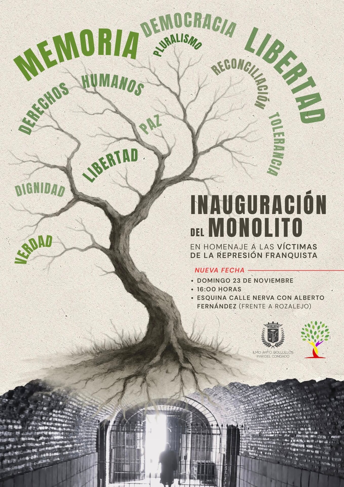 El Ayuntamiento de Bollullos Par del Condado, a través de su Concejalía de Cultura, celebrará el próximo domingo 23 de noviembre a las 16:00 horas la inauguración de un monolito en homenaje a las víctimas de la represión franquista, en el marco de la programación del Otoño Cultural 2025.