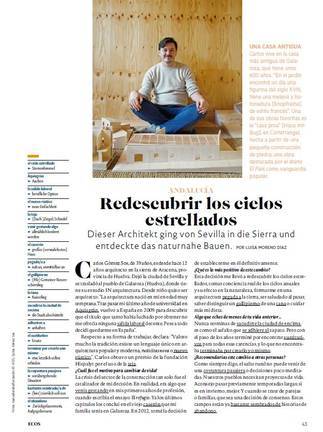 Por otra parte, la reseña dedicada al arquitecto Carlos Gómez Sos se incluye en un reportaje con varios ejemplos de éxodo al campo, con diversas personas que se han instalado en áreas rurales de España en busca de una mejor calidad de vida. Gómez lleva más de una década en Galaroza mostrando otra forma de diseñar construcciones. Desde su estudio, INN Arquitectura, ofrece creatividad manteniendo las formas propias de la arquitectura vernácula serrana.