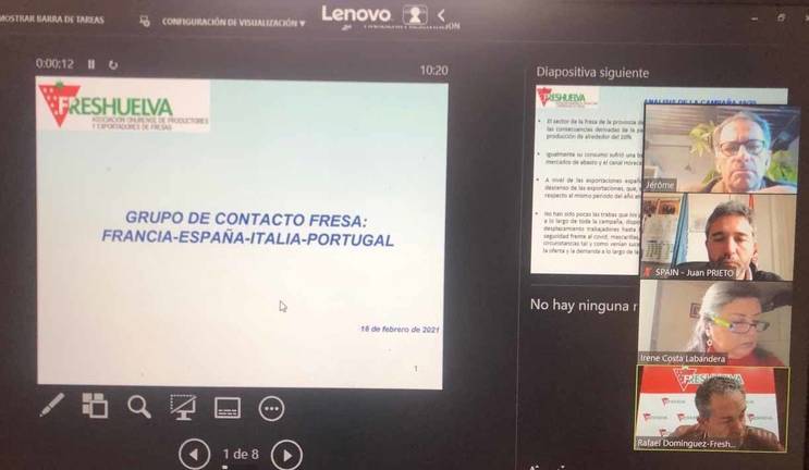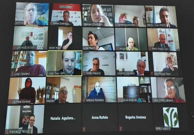 La reunión del grupo de contacto de fresa de Francia, Italia, Portugal y España, que en algunos momentos contó con 35 participantes conectados, ha sido organizada por FRESHUELVA y FEPEX. Junto a los profesionales de los 4 países, intervinieron también responsables de los ministerios de Agricultura, así como responsables de las distintas embajadas.