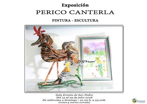 Una nueva exposición, del 15 al 29 de julio, será la de Perico Canterla, que ofrecerá pinturas y esculturas en la Ermita de San Pedro. Este artista y artesano autodidacta de Castañuelo es muy conocido por todos por sus diversas facetas, como la de poeta y también pedáneo de Castañuelo desde hace más de 20 años. Ofrece en esta ocasión una exposición de sus trabajos de pintura en cristal y esculturas hechas con herraduras y material reciclado.