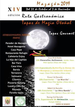 El jueves 31 a las 19 horas junto al edificio multifuncional de Mazagón se inaugura la Ruta con el ya tradicional Pasacalles de Halloween que recorrerá el centro de la localidad con fuego, malabares, zancudos, y música, acompañado por personas de todas las edades que se disfrazan para la ocasión, y a las 21 horas en la plaza Pilar Quilón, junto a la mancomunidad, podremos ver el espectáculo Butterfly (La danza de la mariposa y animación para toda la familia).