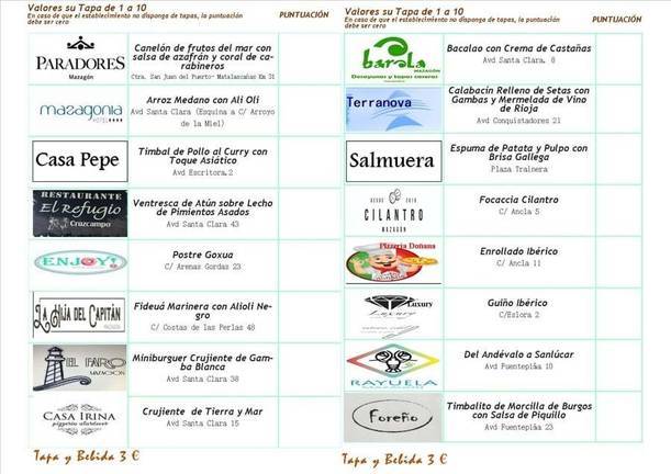 Desde la noche del jueves 31, y hasta el domingo 1 de octubre, los vecinos y visitantes podrán degustar todas estas tapas que nos proponen los locales participantes: Canelón de Frutos del Mar con Salsa de Azafrán y Coral de Carabineros (Parador Cristóbal Colón), Arroz Médano con Ali-oli (Hotel Mazagonia), Timbal de Pollo al Curry con toque asiático (Casa Pepe), Ventresca de Atún sobre lecho de Pimientos Asados (El Refugio), Postre Goxua -tradicional vasco- (Enjoy), Fideuá Marinera con Ali-oli negro (La Hija del Capitán), Miniburguer Crujiente de Gamba Blanca (El Faro), Crujiente de Tierra y Mar (Casa Irina), Bacalao con Crema de Castañas (Barola), Calabacín Relleno de Setas con Gambas y Mermelada de vino de Rioja (Terranova), Espuma de Patata y Pulpo con Brisa Gallega (Salmuera), Focaccia Cilantro (Cilantro), Enrollado Ibérico (Pizzería Doñana), Guiño Ibérico (Luxury), Del Andévalo a Sanlúcar (Rayuela) y Timbalito de Morcilla de Burgos con Salsa de Piquillo (Foreño).