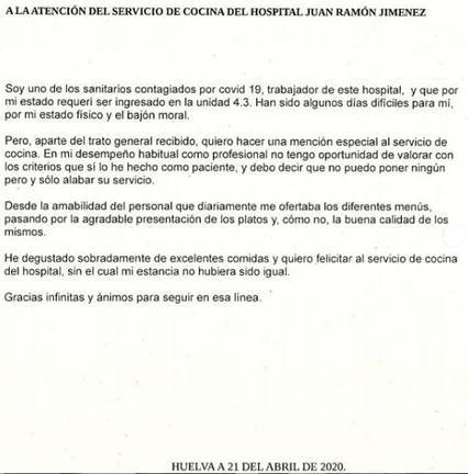 Cartas, donaciones, dibujos, mensajes de cariño... El equipo de cocina ha recibido en estos días muchas muestras de cariño y agradecimiento. "Nos emocionamos al comprobar que los pacientes están contentos con nuestras comidas y que tienen un gesto para hacérnoslo saber; nosotros también hemos querido dejarles mensajes cariñosos y de ánimo y, a veces, nos respondían aunque fuese con una mirada o sonrisa. Muy emocionante comprobar cómo poco a poco las personas que han estado ingresadas por coronavirus han ido mejorando y disfrutando más de las comidas", ha expresado el cocinero.