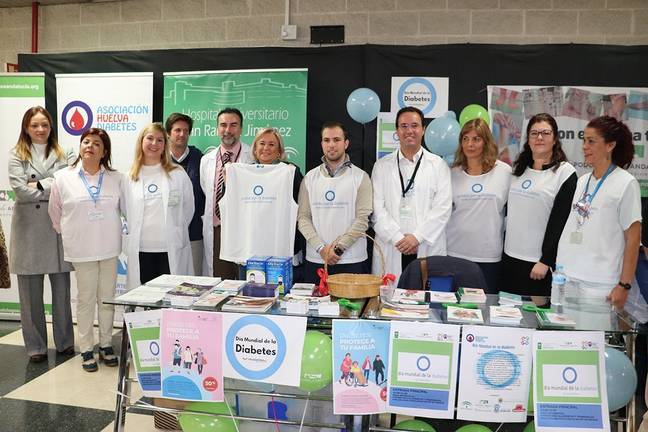 Con este motivo, la delegada territorial de Salud y Familias, Manuela Caro, ha visitado la mesa informativa instalada en hall del Hospital Universitario Juan Ramón Jiménez, acompañada por el director gerente del centro, José Luis Bonilla, profesionales del servicio de Endocrinología y Nutrición, la junta directiva de Huelva Diabetes y podólogos de Huelva, unidos con el lema de este año “Diabetes: Protege a tu Familia”.