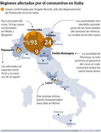 Lombardía acapara la inmensa mayoría de los casos, 89, seguida de Véneto, con 17. En estas regiones se han registrado los dos fallecidos por la enfermedad. A estas regiones se suman Emilia-Romaña, con dos casos, Lacio, con otros dos, y Piamonte. Todas son zonas de paso en los intercambios escolares y excursiones de los institutos de Huelva.
