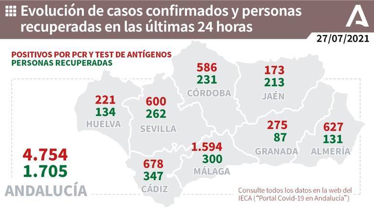 Málaga encabeza el ranking con 1.594 contagios, Sevilla con 600, Cádiz 678, Granada 275, Jaén 173, Almería con 627, Córdoba con 586 y Huelva con 221 cierran las nuevas infecciones.