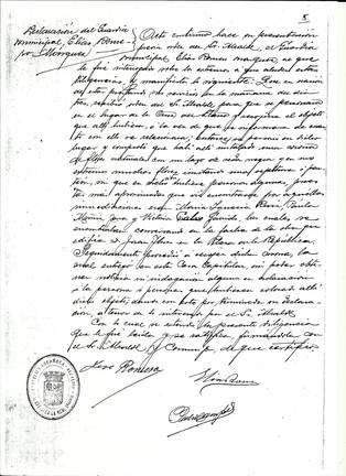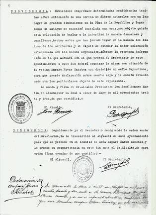 “PROVIDENCIA: Habiéndose comprobado determinadas confidencias tenidas sobre colocación de una corona de flores naturales con un lazo negro de grandes dimensiones en la Plaza de la República y lugar donde de antiguo se encontró instalada una cruz, con objeto quizás esta colocación de burlar a la Autoridad de manera descarada y canallesca, hechos estos que han tenido lugar en la mañana del día tres de los corrientes, y al objeto de obtener la mejor aclaración relacionada con los hechos expresados, ábrase la oportuna información en la que actuará con el que provea, el Secretario de este Ayuntamiento; a cuyo fin deberá comenzar la misma con citación de la vecina Amparo Navas Sánchez, con domicilio en calle Capuchinos, para que preste declaración sobre cuanto sepa y le conste relacionado con los particulares objetos de este expediente. Lo manda y firma el Sr. Alcalde Presidente Don José Romero Martín, en Almonaster la Real, a cinco de Mayo de mil novecientos treinta y tres, de que certifico”.