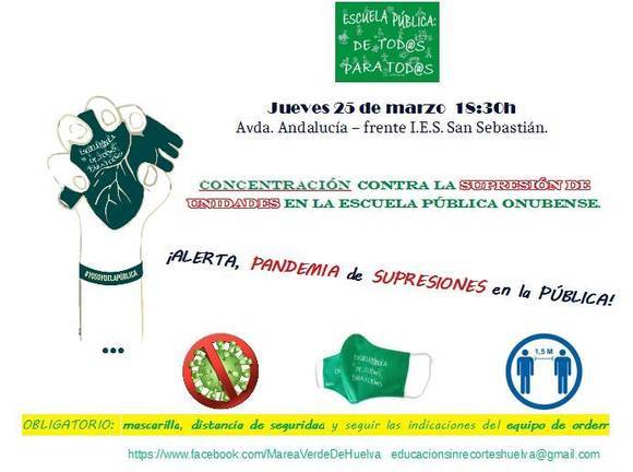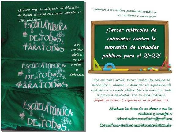 Estos padres no están solos. Desde la plataforma Marea Verde Huelva han expresado su posición al respecto y es que "hace varias semanas conocimos las intenciones de la Delegación de Educación de Huelva de suprimir dos unidades de infantil en los CEIP Prácticas y San Fernando, de la capital. A partir de ese momento han ido saliendo a la luz nuevas supresiones a lo largo y ancho de nuestra provincia. Sabemos que en el resto de Andalucía la situación revierte la misma gravedad: al tiempo que se recorta en la escuela pública en forma de supresiones de unidades, especialmente de infantil y primaria, se mantiene intacta, o incluso se aumenta, la oferta de unidades concertadas en los centros privados".