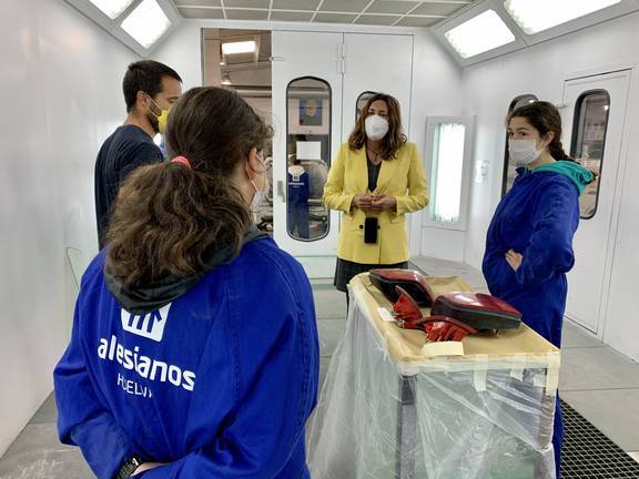 Loles López ha subrayado la importancia que tiene que los alumnos alternen su formación entre escuela y empresa, como permiten los ciclos de FP Dual, para afrontar con éxito su incorporación al mercado laboral y reducir la tasa de paro entre los jóvenes. Además, ha agradecido la labor que realiza “la familia” de Salesianos Huelva en la formación y conocimiento, aún más en “estos momentos difíciles de pandemia donde toda la comunidad educativa se ha adaptado razonablemente a las circunstancias”.