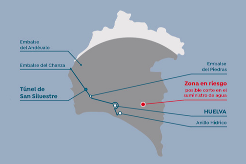 Respecto a las reservas de agua disponibles en los tres grandes embalses de Huelva, Andévalo, Chanza y Piedras, si ocurriese algo en esta canalización, la situación es clara: “si el túnel deja de funcionar anula el agua embalsada en el Chanza y el Andévalo, situados ambos antes del túnel de San Silvestre, y sólo podríamos contar con el agua que tengamos embalsada en el Piedras, en la zona sur del mismo”. Actualmente, se encuentra al 70 % de su capacidad, lo que supondría unos 3 meses de abastecimiento de agua. Sobre este agua tendría prioridad –con restricciones– el consumo humano, dejando fuera la industria, la agricultura o el turismo.