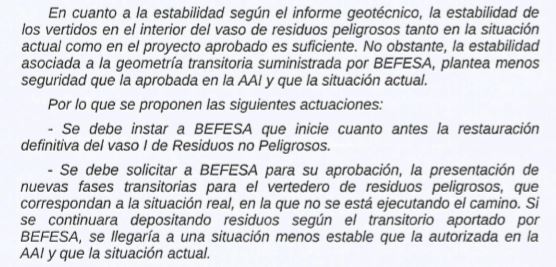 Preguntada Ditecsa por el informe de la Dirección de Prevención Ambiental que cuestiona la seguridad y la estabilidad del vertedero y realiza una serie de recomendaciones de mejora en los vasos de las instalación, la gestora también desvía la cuestión a la Consejería de Medio Ambiente, a la que dice obedecer en todas sus recomendaciones y subraya que la planta de Nerva cumple todas las normativas. Ditecsa califica de “normal” el funcionamiento de la instalación ubicada en Nerva.