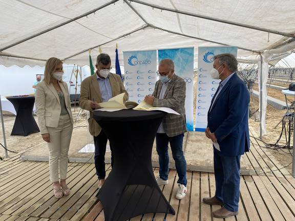 La firma, celebrada en Rociana del Condado, ha estado presidida por la subdelegada del Gobierno de España en Huelva, Manuela Parralo. En el acto también han participado el presidente de la Comunidad de Regantes El Condado, Juan Mato, y el director del proyecto, Ramón González Carvajal.