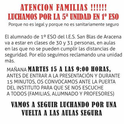 Mientras tanto, en Aracena el IES San Blas reclama la quinta unidad para 1º de ESO ante unas ratios que consideran ilegales. Para denunciar su situación han convocado una asamblea conjunta de la comunidad educativa y proponen que no se entre en las aulas con ratios elevadas si no se garantiza la distancia de seguridad. Y anuncian manifestaciones y seguimiento de los paros y huelgas convocadas.