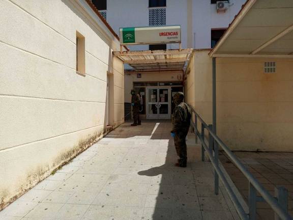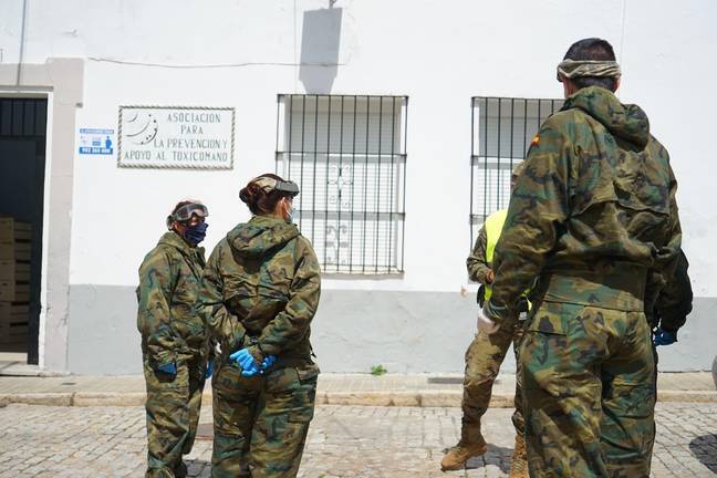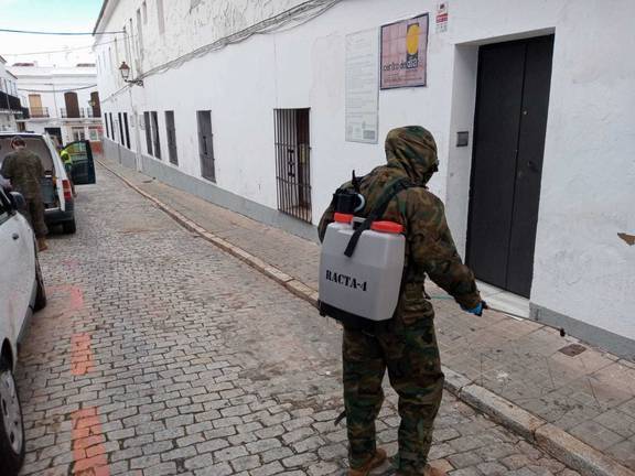 Diez militares del Ejército de Tierra, provistos de estrictas medidas de seguridad para el desarrollo de su trabajo, y cuatro vehículos, dos militares y dos civiles, han llegado a la localidad con el fin de realizar labores de desinfección en la residencia de mayores 'Lerdo de Tejada', el centro de salud, ASPREATO (Asociación para la Prevención y Apoyo al Drogodependiente) y la calle Santa Clara.