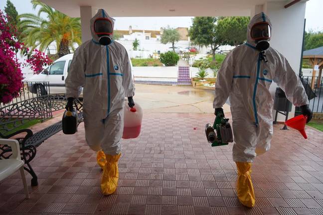 Lo han hecho dotados con mochilas cargadas con lejía y otros desinfectantes de uso exclusivo profesional, que se aplican mediante un proceso de termonebulización, un novedoso y eficaz sistema que se lleva a cabo creando una nube no líquida que permite el acceso de los productos desinfectantes a todos los rincones, grietas, rejillas y huecos a los que no llega la desinfección tradicional, logrando así una desinfección profunda y exhaustiva, especialmente de los espacios cerrados.
