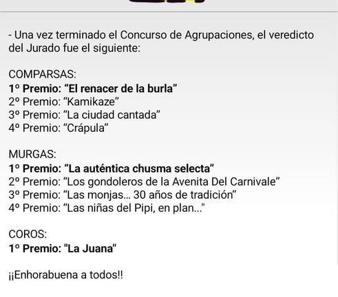 En cuanto a los premios del concurso, la agrupaciones ganadoras fueron el Coro "La Juana", la Murga “La Chusma selecta (Tikismikis)”, y la Comparsa “El despertar de la Burla”, todas ellas, agrupaciones isleñas.