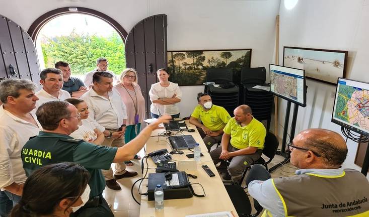 El viceconsejero de la Presidencia, Administración Pública e Interior de la Junta de Andalucía, Antonio Sanz, junto al delegado del Gobierno andaluz en Huelva, en funciones, Álvaro Burgos, y la alcaldesa de Almonte, Rocío del Mar Castellano, junto con Macarena Robles, cuarta Teniente de Alcalde y Concejal-Delegada de la Aldea de El Rocío, han acudido a primera hora de la mañana al PMA para comprobar de primera mano que todo estaba a punto. "Este Puesto de Mando, con representación de todas las administraciones es un ejemplo de cooperación y coordinación del que nos sentimos orgullosos y satisfechos", ha señalado Antonio Sanz.