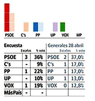 El incremento de votos al PSOE sería una de las causas del cambio de este escenario político actual, ya que el PSOE alcanzaría los 3 escaños, uno más que las anteriores generales; el Partido Popular mantendría su escaño y VOX se alzaría con uno, tras 'perderlo' en la anterior por 300 votos frente a Unidas Podemos, que en esta ocasión se quedaría sin escaño al igual que Ciudadanos.