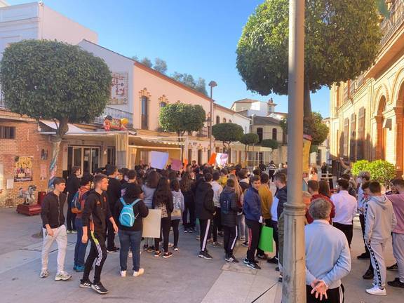 Los estudiantes de Nerva y de varios municipios de la Cuenca Minera han protagonizado este jueves una marcha anti-vertedero en toda regla. Y desde el IES Vázquez Díaz se han trasladado a las inmediaciones del cementerio de residuos tóxicos y peligrosos para dejar clara su postura.