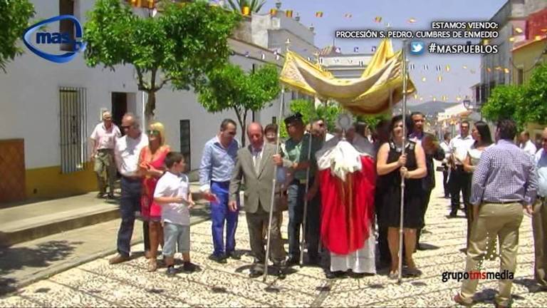 Pie de foto: Eulogio Páez, primero por la izquierda, sostiene uno de los varales del palio en una de las procesiones de Cumbres de Enmedio.