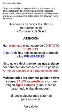 En el mensaje se afirma que se ha eliminado el concepto de contacto estrecho y desde ahora solo se aplicará el protocolo a las personas vulnerables. El mensaje dice que "no hay que aislarse por haber tenido contacto con un positivo a menos que se trate de una persona vulnerable".