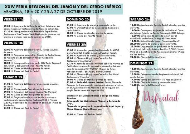 La inauguración oficial de la feria y apertura de stands de manos de las autoridades políticas, tendrá lugar el viernes 18 a las 13:00 horas en el Pabellón Ferial Ciudad de Aracena. A partir de ahí, en horario de mañana y tarde, el Recinto permanecerá abierto hasta el domingo 20, para reabrirse en el mediodía del viernes 25 hasta el domingo 27.