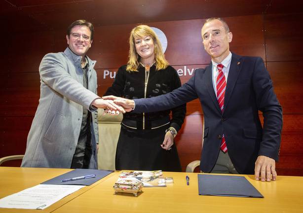 La presidenta de la Autoridad Portuaria de Huelva, Pilar Miranda, ha presentado hoy junto con el presidente de la Hermandad de Villalba del Alcor, Daniel Aguirre y el alcalde de localidad, Diego del Toro, las Fiestas Patronales con las que colabora este año el puerto onubense.