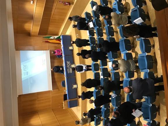 El presidente de la FOE comenzó su discurso hablando del duro año que nos había precedido, recordando los miles de fallecidos por la COVID y por lo que se guardó un emotivo minuto de silencio. Tuvo especial mención a destacados miembros de la FOE que perdimos este año, Juan González Guijosa, Eduardo Mateo Suero, Francisco Fernández Vizcaya y Jesús Gómez Alonso.