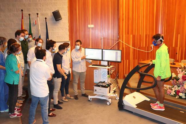 El salón de actos del Hospital Juan Ramón Jiménez ha servido también de escenario para la realización de diversos talleres prácticos. Entre ellos, se ha mostrado la ergoespirometría, única prueba que valora de forma objetiva el grado de limitación del paciente y la causa (el motivo por el cual se ahoga): respiratoria, cardíaca, sedentarismo, etc. Resulta de gran utilidad para indicar si son necesarias terapias avanzadas, como el trasplante cardíaco o la asistencia ventricular.