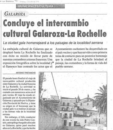 Durante los doce meses se desarrollaron importantes acontecimientos, como por ejemplo el intercambio con la localidad francesa de La Rochelle. Impulsado por Pedro A. Cantero, que fue galardonado con el Pero de Oro de Galaroza, los cachoneros visitaron Francia y también los franceses llegaron a Galaroza y conocieron sus paisajes, fiestas y hospitalidad.