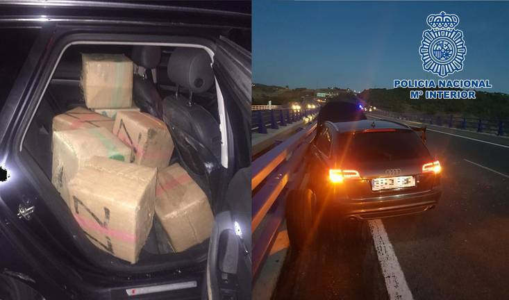 De este modo, y una vez que los investigadores determinaron la modalidad delictiva, el pasado mes de octubre se produjo la primera aprehensión de droga a la altura del peaje de la Autopista AP-7 en el termino municipal de Estepona (Málaga), donde los agentes dieron alcance a un vehículo de alta gama al colisionar éste contra la mediana de la vía, interviniendo 225 kilos de hachís distribuidos en siete fardos y colocados en el interior del vehículo, por lo que se detuvo al conductor del vehículo, al tiempo que el copiloto, tras producirse el accidente, pudo huir campo a través.