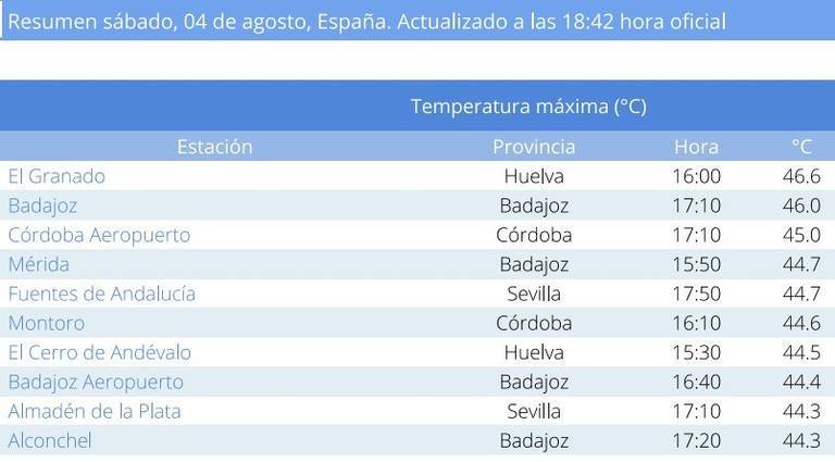 Segundo día consecutivo de temperaturas máximas en la localidad de El Granado con récord de toda España y esta vez, con más calor aún que ayer. La localidad de El Granado ha registrado durante esta tarde una temperatura de 46,6 grados centígrados, dos décimas por encima de la registrada en el día de ayer y con la que fue líder nacional en el ránking de temperaturas máximas.