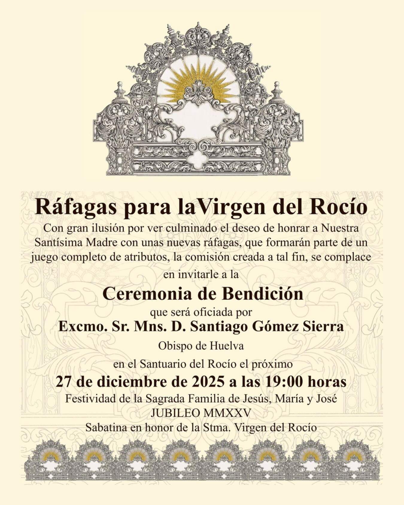 Tras la misa, se procederá a la ceremonia de bendición del conjunto de nuevos atributos diseñados por Chesco Fernández y realizados en el taller de orfebrería de Ricardo, de Sanlúcar de Barrameda, para honrar a Nuestra Santísima Madre, la Virgen del Rocío. Este proyecto ha sido sufragado mediante suscripción popular de los devotos, cuyos detalles se pueden consultar en la web oficial de la Hermandad.