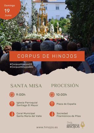 Como novedad en esta edición, se adelanta la hora de la Santa Misa y, por consiguiente la salida procesional de la Custodia. Así pues, el cura párroco, D. Manuel Beltrán, oficiará la Eucaristía el domingo, 19 de junio, a las 9:00h en la Iglesia de Santiago El Mayor y la misa será cantanda por la Coral Municipal Santa María del Valle. El Santísimo iniciará su recorrido por las principales calles del municipio en torno a las 10:00h e irá acompañado bajo los sones de la Sociedad Filarmónica de Pilas, a la que se suman las hermandades de gloria y penitencia de la localidad, corporación municipal, autoridades, así como por los niños que este año han recibido la Primera Comunión.