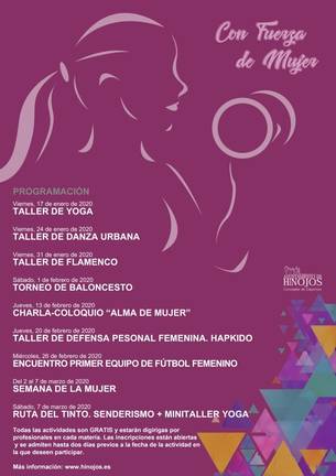 En este sentido, y para visibilizar la participación femenina en la práctica deportiva, se ha diseñado un calendario muy diverso de actividades que comienza con un Taller de Yoga, y que incluye Danza Urbana, Flamenco, Torneo de Baloncesto, Charla – Coloquio “Alma de Mujer”, Hapkido, defensa personal femenina, encuentro del primer equipo de Fútbol Femenino, Semana de la Mujer, del 2 al 7 de marzo, con acceso gratuito a todas las modalidades deportivas que se ofrecen en el Polideportivo Municipal, y senderismo y mini taller de Yoga por el Tinto, el 7 de marzo, con el que finalizará el programa.