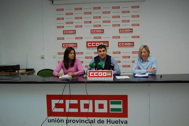 El secretario general de CCOO en Huelva, Emilio Fernández, junto a María José López Fernández, delegada del comité de empresa de SAMU, y María Benjumea, del comité de empresa de Al Alba, han anunciado las diferentes acciones que se van a tomar desde el sindicato.