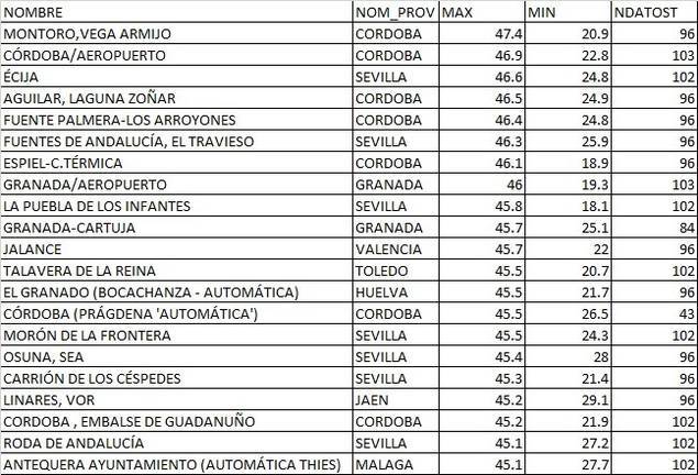 Los registros, según recoge MeteoHuelva asustan e imponen: Villanueva de las Cruces 46,3 °C; El Granado 45,4 °C; Valdelamusa - Aguas Teñidas 44,3 °C; Aroche 43,8 °C; Huelva - La Ribera 39,8 °C Huelva - Ronda Este 37,9 °C Huelva - F. Montenegro 34,8 °C.