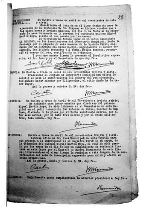Carmen, su mujer, jamás se recuperaría del trauma que todo esto supuso para ella y para su familia. Tras el asesinato de su esposo, quedó viuda, con un hijo de siete años y un bebé recién nacido, y todavía tendría que enfrentarse al proceso posterior de incautación de bienes. Tuvo que sufrir el también acostumbrado intento de legitimar la muerte de su marido, proponiéndole los representantes del nuevo régimen que declarase que Miguel había muerto en combate, a cambio de conservar su casa. De hecho, en el certificado de defunción de Miguel Martín Moya, el médico forense se limitó a certificar la causa de su muerte como “hemorragia”.