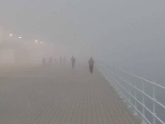 Un espeso manto de niebla envuelve Huelva y sorprende a los paseantes