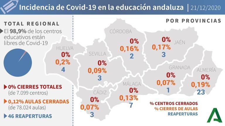 Sin embargo, la provincia de Huelva ha sido la que mayor porcentaje de Andalucía ha tenido aulas cerradas con un 0,2%; seguida de Almería con 0,19%, Jaén con 0,17%, Córdoba con 0,16%, Málaga con 0,13%, Sevilla con 0,09% y Cádiz con 0,07%.