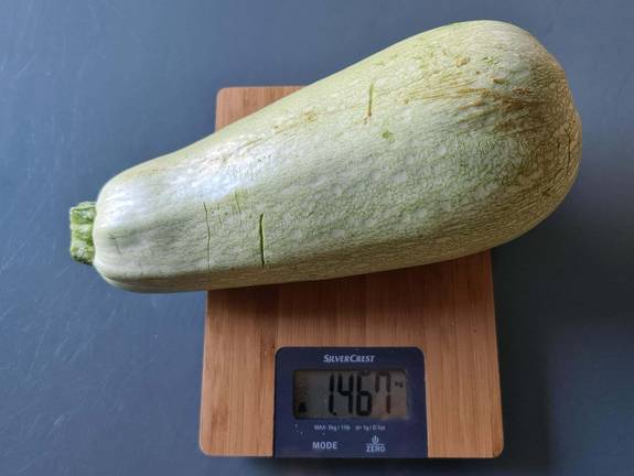 El 1 de julio comienza a recolectar calabacines gigantes, algo que corrobora dos días después pesando uno de 1.467 gramos, que además están riquísimos, según pueden comprobar.