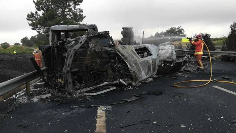 El incendio de un camión con mercancías peligrosos provoca el corte de la A-49 en La Palma