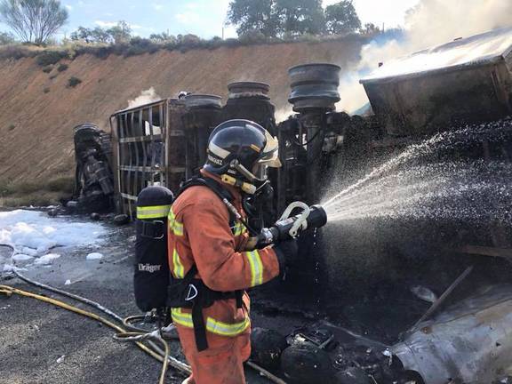 Los Bomberos del Consorcio Provincial de Huelva han sofocado el incendio del camión articulado que transportaba gasóleo B que se propagó a un segundo camión que cargaba arena y a un turismo.