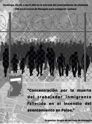 Un grupo de vecinos de Mazagon recordará con un minuto de silencio al trabajador fallecido hace unos días en el fuego producido en el asentamiento donde vivía, en Palos. Para ello han convocado un acto solidario que se desarrollará junto al lugar donde vivía. Se leerán poemas y textos en recuerdo de la víctima del fuego.
