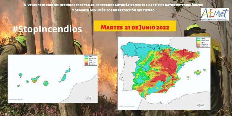 Mientras, el mapa de riesgo de incendios daba un leve respiro a la provincia de Huelva aunque justo esta zona afectada estaba en riesgo alto.