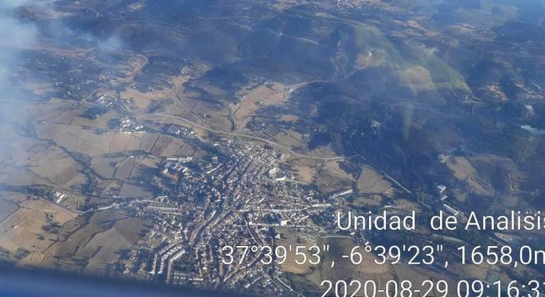 El fuego ha rodeado por completo Zalamea pero no ha llegado a sus casas. Parece un milagro. La foto aérea distribuida hoy por el Plan Infoca muestra al pueblo rodeado de tierra quemada, y el casco urbano indemne.