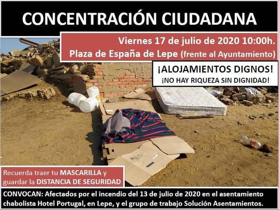 Por otra parte, para este viernes a las 10:00 de la mañana se ha convocado una concentración ciudadana en la plaza de España, frente al ayuntamiento de Lepe para poner en evidencia las condiciones de vida que soportan los inmigrantes que residen en los asentamientos y las tremendas dificultades que sufren a la hora de buscar alojamientos o viviendas de alquiler. No entienden cómo pueden trabajar en las explotaciones agrarias y que luego se desentiendan de sus condiciones de vida.