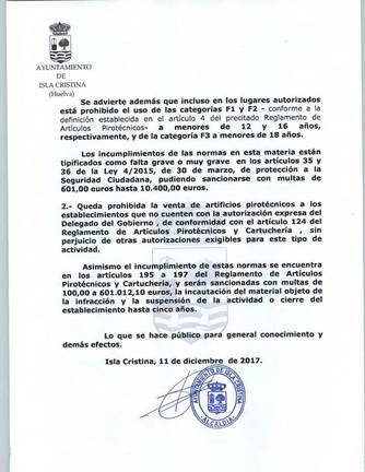 Según el bando municipal de Isla Cristina, "en este mes de diciembre se ha comprobado que prolifera un uso indebido de artificios pirotécnicos en la vías públicas de nuestra población, con el desconocimiento de que tales actividades son contrarias a las normas y a la buena convivencia, además de ocasionar alarma y daños que afectan en mayor medida a colectivos vulnerables como son las personas mayores y niños".