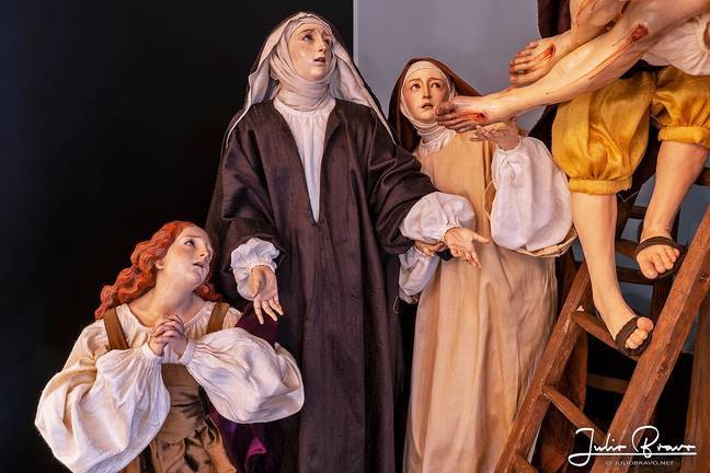 Parra detalla que “el eje principal de la composición” se centra en Jesús de Nazaret, José de Arimatéa, Nicodemo, San Juan Evangelista y un ayudante que desciende el cuerpo sin vida de Cristo de la cruz. “Él era un hombre rico y fue el encargado de pedirle el cuerpo de Jesús a Pilates para darle sepultura, además de ser propietario del sepulcro en el cual fue depositado”.